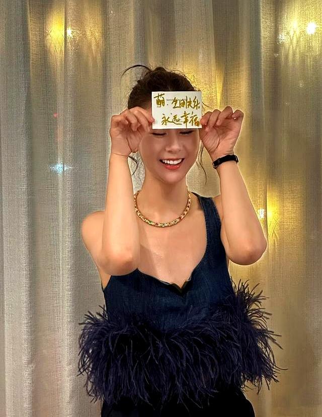 头上戴了个“生日快乐”的发箍,项链亮晃晃,笑得跟二十出头的似的。